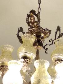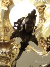 Bellissimo e importante lampadario anni 70 in ottone brunito, a due piani complessivamente formato da 18 bracci con bocce in vetro, il lampadario presenta decorazioni importanti con teste di angelo a rilievo.