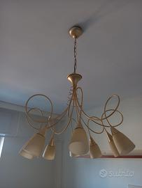 Lampadario in ottone satinato e vetro opalescente a otto lampade attacco e14. Buonissime condizioni e funzionante.