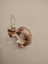 Vendo incantevole set coordinato di lampade in pregiata porcellana stile Capodimonte, riccamente decorate con dettagli floreali e rose applicate nei toni del rosa e del verde, arricchite da preziose finiture in oro zecchino.