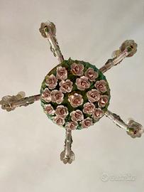 Vendo raffinato lampadario in porcellana Capodimonte, elegante , vintage/antico,realizzato a mano negli anni ’50/’60 e decorato a mano con splendide rose rosa in rilievo. Il corpo centrale è ornato da un ricco motivo floreale con rose rosa e foglie verdi, mentre i bracci sinuosi sono arricchiti da piccoli dettagli floreali dipinti a mano.