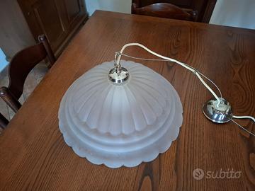 Lampadario a sospensione in vetro bianco-trasparente dall'effetto caldo e accogliente. Adatto ad ambienti quali cucine, sale da pranzo, soggiorni. Perfettamente funzionante.
