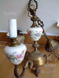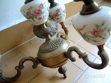 Bellissimo lampadario in metallo a tre bracci che sorreggono ampolle in ceramica decorata e porta lampadina a forma di candela. Bulbo a soffitto in ceramica decorata uguale alle ampolle. Rosone a soffitto e corpo centrale in metallo lavorato. Altezza escluso rosone 40 cm circa, larghezza 38 cm circa. Marcato Targetti Sankey. Euro 90,00.