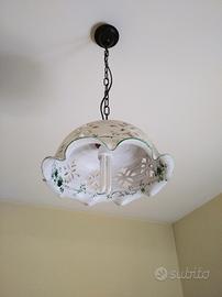 Bellissimo lampadario realizzato artigianalmente da decoratrice di Ascoli Piceno dove è stato acquistato . Si tratta di terracotta pitturata di bianco e decorazione verde scuro . Catena in metallo brunito.