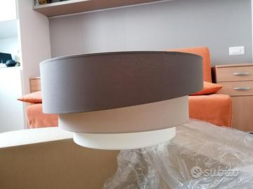 Lampadario che unisce lo stile classico al moderno di colore tortora, marrone e bianco, paralume in tessuto.