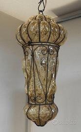 Vecchio lampadario in vetro di Murano ambrato soffiato a bocca con struttura in ferro battuto