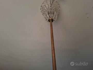 E' sorretto da un asta centrale di ottone con coppella in vetro che appoggia al soffitto. Le foglie sono inserite in un disco di legno che riporta tuttora il numero scritto a mano dal maestro vetraio. La parte inferiore del corpo illuminante e' costituita da una coppella di ottone battuto a mano.