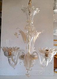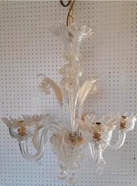 Bellissimo lampadario in vetro di Murano nuovo, stile classico vintage, 5 luci E14. Colore del vetro cristallo oro. Catena oro.