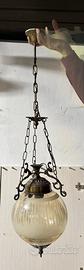 Lampadario boccia in vetro lavorato e decorazione in ferro battuto.