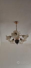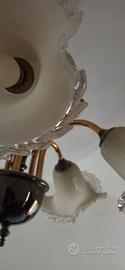 Questo è un lampadario classico in ottone e vetro con paralumi smerlati opalini.