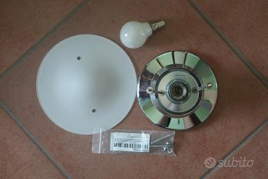 Il lampadario monta una lampadina con attacco E14, protetta da una piccola coppetta in vetro fissata con due viti, che aggiunge un tocco estetico e allo stesso tempo diffonde meglio la luce.