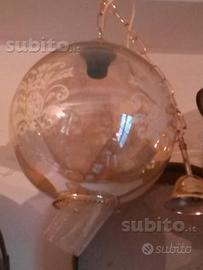 Lampadario vintage funzionante con catena in ottone e palla in vetro lavorato, in buono stato. Ho altri lampadari simili se interessati contattare.