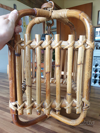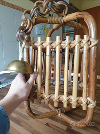 Lampadario in vimini, con rosone in ottone, da soffitto. Misure: H 44, largo 24. Ulteriori 37 cm, lunghezza ganci in bambù e rosone per attacco a soffitto