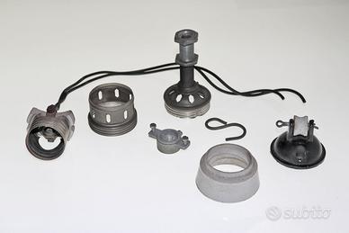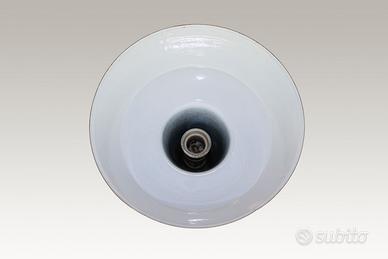 Esterno smaltato Nero e interno smaltato bianco, non modificato, completo di portalampada con ghiera in ceramica attacco E40 e componenti originali anni '50. Lampadario di grandi dimensioni: diametro paralume 40/40,5 cm; altezza paralume 27,5cm; altezza totale 33,5cm (regolabile).