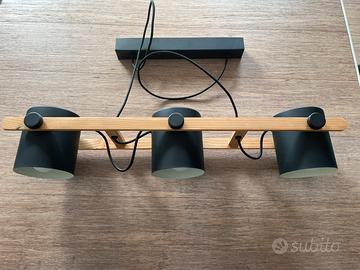 Lampadario JYSK in metallo nero con dettagli in legno. Misura 78×16×15 cm, con portalampada da Ø13 cm. Sospeso con due cavi regolabili, può essere posizionato a 80–100 cm dal soffitto. Design moderno, ideale per cucina o soggiorno.
