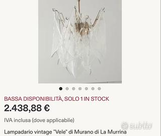 Lampadario da soffitto a tre luci di vetro di Murano originale La Murrina NUOVO. Pagato migliaia di euro. Ovviamente NO TRATTABILE. Usato lo vendono a 2.500 euro come si vede nell’ultima foto!!! Lo stiamo regalando a questo prezzo!