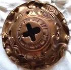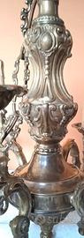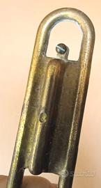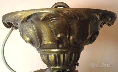 Lampadario a sospensione "Lamp Art" Corpo realizzato in ottone a pressofusione per un peso totale di 10 kg. - 9 luci funzionanti. Anni (con certezza) 70/72 – Altezza senza catena Cm.48 con catena Cm. 90 – Diametro 66. Il lampadario non ha mai subito restauri, non presenta fratture né ammaccature. Nessuna componente molla bensì forti e salde e, nessun pezzo mancante "anche i fili elettrici sono d'epoca" La scritta a stampo da fonderia MOD DEP LAMP ART STILE viene riprodotta nel lampadario per ben 11 volte. Una volta dentro il cono copri fili del soffitto (come da foto) una volta all'interno di ogni 9 sotto luce e infine, sul gancio. Pertanto l'autenticità è ben riportata e visibile. Il lampadario si presenta con bella patina d'epoca.