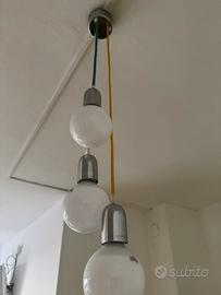 Vendo lampada a sospensione moderna con tre portalampade e cavi colorati (blu, giallo e arancione). Design minimal e originale, ideale per cameretta bambino, studio, cucina o soggiorno.