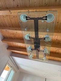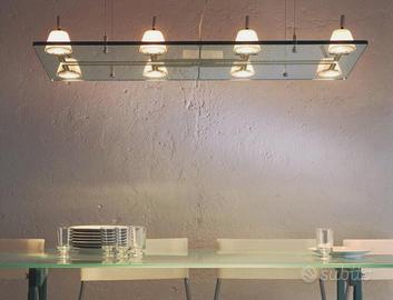 Il corpo del lampadario è composto da una lastra rettangolare in vetro temperato trasparente, con 8 diffusori in vetro pressato e verniciato di colore bianco.