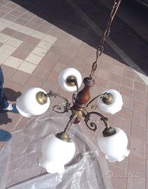 Elegante lampadario in stile ‘900 classico con corpo in pino massello tornito e struttura in ottone lucidato e lavorato con intarsi floreali, con motivi decorativi sui 5 robusti punti luce, corredati da 5 vetri soffiati bianco lucido e bordati oro, con attacco lampadina E14.Diametro senza paralumi 60cm ed altezza 1 metro. Catena e cupolino ottonati per fissaggio sospeso e cablaggio elettrico nuovo. Ritiro presso abitazione e pagamento in contanti, prezzo trattabile. Già smontato pulito e confezionato, con suoi paralumi. Ritiro presso Abitazione pagamento in contanti