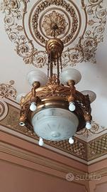 Vendo lampadario in ottone liberty, coppa centrale in vetro due luci, sei luci superiori con coppe di vetro satinato e decorato e sei luci inferiori.