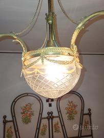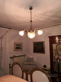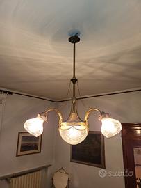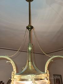 LAMPADARIO CON STRUTTURA IN OTTONE, CON 3 BRACCIA PORTA LAMPADA, IL LAMPADARIO E' COMPOSTO DA 3 LUCI PIU' 1 INFERIORE CENTRALE.