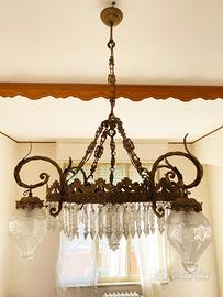 Lampadario anni 40-50 a sospensione in ottone/bronzo stile Liberty con pendagli a prisma in cristallo e vetri satinati (gusto Déco).