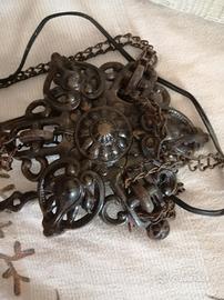 Vendo lampadario/lucerna antica in ferro battuto a mano e ceramica con motivo floreale verde/rosso bordeaux con boccia. Copertura cappa in vetro opalina bianca come da foto rotta da un lato. Misure 1 metro di altezza, diametro opalina 33/34 cm con cerchio di perline che si può togliere o mettere a piacimento. Possibile visione in loco e avere altre foto. Il prezzo sull'annuncio è riferito alla lucerna con opalina rotta. Possibile avere forse anche opalina intonsa (devo cercarla) ma il prezzo cambierebbe. Rimango a disposizione per wualsiadi richiesta. Altre lucerne/lampadari simili piu piccoli se interessati. Solo ritiro in loco