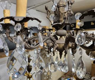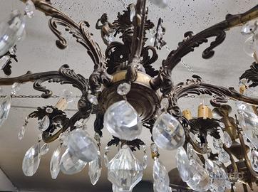 In bronzo e gocce di cristallo, cesellato con volute, fogliame e motivi rocaille. Presenta tre cherubini in bronzo, adatto per illuminare e decorare grandi ambienti con 55 cm di diametro e otto punti luce. L'impianto elettrico va valutato in base alle norme vigenti.