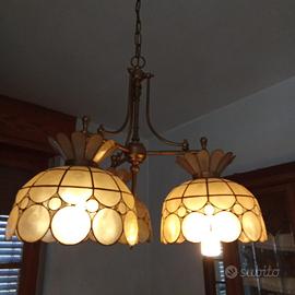 Lampadario vintage , a sospensione in stile Tiffany con paralumi in madreperla (conchiglie capiz ) e struttura in ottone. E’ caratterizzato specificatamente dall'uso di vere conchiglie di capiz naturale che creano un effetto luminoso caldo e diffuso.