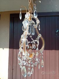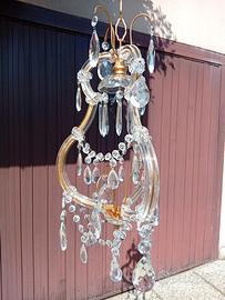 Lampadario in stile Maria teresa a 1 luce anni 60 sospensione con montatura in metallo dorata , ricoperta di listelli e roselline in vetro di Murano, ricco di festoni e gocce in vetro murano, completamente restaurato, funzionante luce centrale con portalampada in metallo e porcellana e27.