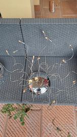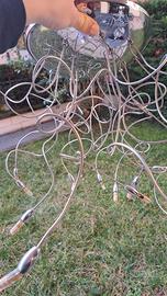 Lampadario dal design unico che ricorda una medusa. La struttura in metallo argentato si intreccia creando un effetto scenografico, con dettagli in vetro trasparente.