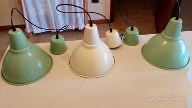 Vendo a € 40 tre lampade a sospensione IKEA dal design classico e intramontabile. Questa lampada diffonde una buona luce diretta sul piano. Struttura realizzata in robusto metallo con verniciatura opaca, la lampada è semplici da montare, regolare e pulire. Molto pratica e funzionale, questa lampada si adatta a tutti gli ambienti (interni ed esterni coperti) e gli usi grazie alla sua versatilità. Molto facile regolare l'altezza della lampada in base alle tue esigenze: è sufficiente sollevare la calotta di copertura nella parte superiore del paralume e avvolgere il cavo. Due sono di colore verde menta e una è di color avorio con i relativi cavi e calotte sempre in metallo e sempre di colore coordinato. Dimensioni e caratteristiche tecniche: Altezza 15 cm, Diametro Max 25 cm, Lunghezza filo elettrico 1.5 m, Max 60 W. Incluso nel prezzo tre paralumi a tronco di cono in vetro satinato (Altezza 27 cm, Diametro maggiore 15 cm, Diametro minore 10 cm), interscambiabili con i paralumi originali in metallo, per una doppia possibilità di usi e combinazioni. Incluso nel prezzo due lampadine a risparmio energetico E27 Beghelli Compact 10000 da 25W 6500°K e una lampadina a risparmio energetico E27 Beghelli Compact 10000 da 20W 6500°K.