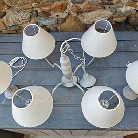 Lampadario a 4 bracci con struttura in metallo grigio chiaro effetto anticato, paralume in tessuto di lino e cotone ecrù, cavo incluso.