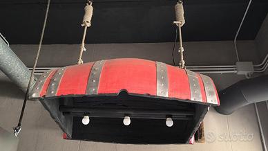 lampadario botte, arredo pub, arredo industrial, lampada sospesa, mezza botte, arredo rustico, handmade, illuminazione design, arredo bar, arredo enoteca, ferro e legno, arredo vintage, pezzo unico, decorazione scenografica tel 3667288382