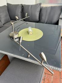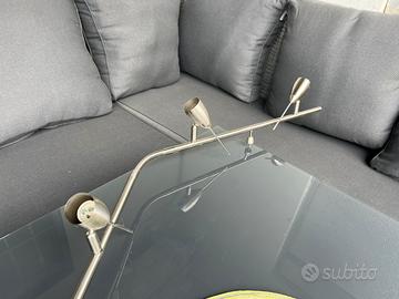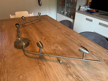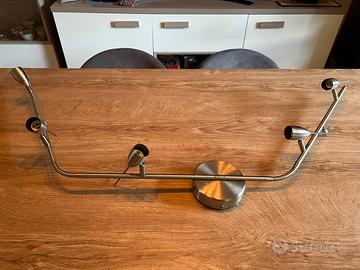 Vendo lampadario moderno in acciaio satinato con 4 faretti orientabili, perfetto per illuminare soggiorno, cucina o studio con stile e praticità.