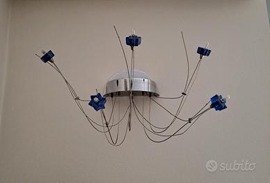 Lampadario moderno a plafoniera con 24 punti luce con diffusori in vetro a stella bianchi e blu, su bracci a fili sottili parzialmente regolabili.