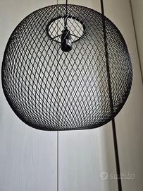Lampada a sospensione in rete metallica colore nero e filo ricoperto in tessuto intrecciato nero.