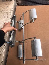 Vendo elegante set illuminazione composto da lampadario a 4 luci con struttura in metallo dal design moderno/industriale + applique singola coordinata. • Ogni luce è completa di copertura in vetro satinato come visibile nella foto dell’applique Scrivimi in privato per info o altre foto! Ritiro a carico dell’acquirente al piano strada