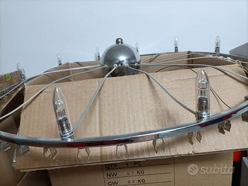 Lampadario a sospensione moderno composto da una serie di "candelotti" di vetro di varie dimensioni che si agganciano intorno alla corona principale.