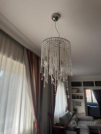 Vendo lampadario moderno con struttura in metallo cromato e pendenti in cristallo trasparente e ambra.