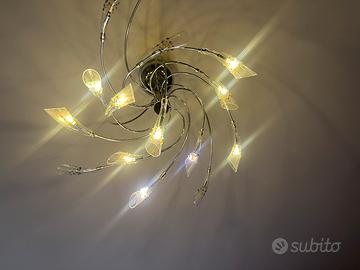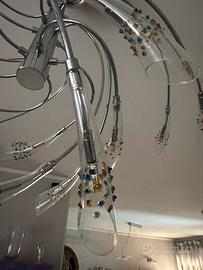 "Vendo scenografico lampadario moderno con struttura a spirale in metallo cromato. Il design è caratterizzato da bracci dinamici che terminano con eleganti diffusori a cono in cristallo. Ogni cono è impreziosito da gocce in vetro colorato applicate artigianalmente, che creano giochi di luce unici nell'ambiente. Le sue condizioni sono Perfettoe, nessun cono scheggiato, pronto per essere installato. Ideale per un salone, una sala da pranzo o una camera da letto che necessita di un tocco di colore e design originale."