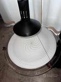 Elegante lampadario a sospensione dal design moderno e minimalista. È composto da una struttura centrale nera con portalampada e da un ampio diffusore circolare in vetro di murano con raffinata lavorazione a cerchi concentrici. Il disco è sostenuto da sottili cavi che creano un effetto leggero e contemporaneo.