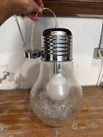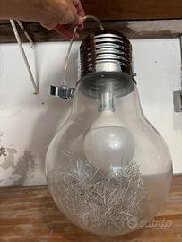 La sorprendente sospensione ha la forma di una grande lampadina; il diffusore è in vetro soffiato trasparente con elemento decorativo interno in filo di alluminio.