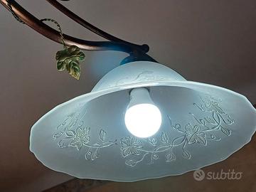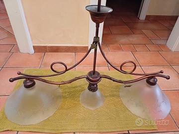Vendo bellissimo lampadario in ottimo stato in ferro battuto con pannellature oro antico e diffusori vetro satinato con sfumature ambra . H84 , largh 108. Lampadine escluse, per altre foto in privato.