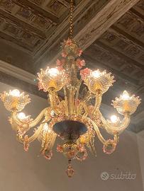 Grande lampadario di otto luci in vetro soffiato di Murano ambrato con decori rosa. Realizzato a mano con tecniche tradizionali e arricchito da anelli, foglie e fiori modellati da maestri vetrai. Montatura in metallo. Epoca prima metà del novecento. Dimensioni: diametro 90 cm, altezza 100 cm. Mancante di un anello e quattro foglie, ma poco visibile alternando le foglie. Non ci sono rotture.
