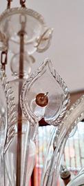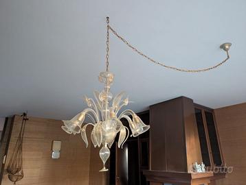 Lampadario a 6 luci fatto a mano secondo l'antica tradizione del vetro di Murano, realizzato artigianalmente nelle fornaci Veneziane (1978). Oggetto raro per il suo colore con iridescenza dal bianco al dorato (sfumature di oro 24kt), elementi alti e bassi con foglie. Lavorato sia sul fusto che nella parte bassa. Dimensioni: altezza 80 cm, diametro 80 cm. Disponibili ricambi degli elementi più fragili.