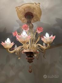lampadario Murano originale rosa a sei luci arricchito da fiori e foglie molto bello ritiro a mano
