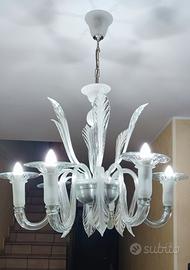 Lampadario in vetro soffiato a sei luci lavorato da artigiani vetrai di Murano, stile classico ma anche moderno Ideale per tutti gli ambienti per la sua forma moderna come le foglie sottili ed allungate sapientemente lavorate dai maestri vetrai nelle fornaci. Oggetto dal design pulito che si inserisce facilmente nei contesti più variegati riuscendo ad impreziosire un angolo o una stanza.
