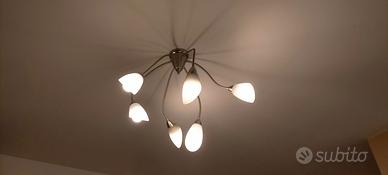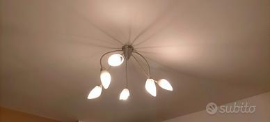 Lampada da parete o soffitto. Corpo in metallo cromato, sei bracci flessibili e snodabili. Lampade ecoalogene, attacco E14, potenza massima 42W. può montare lampade a risparmio energetico o led. Il diffusore in vetro di Murano incamiciato.