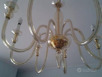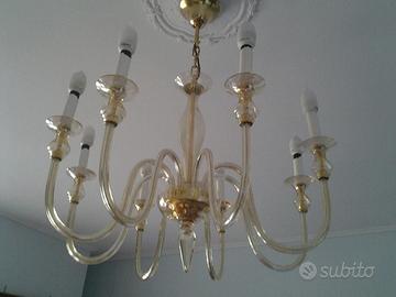 Vendo lampadario classico in vetro soffiato color ambra/paglia, stile Murano. 8 luci con attacco E14, struttura elegante con bracci ricurvi e pendente centrale. Montatura color oro. In ottime condizioni, perfettamente funzionante. Dona molta luce e un tocco raffinato ad ambienti classici. Ideale per soggiorno o sala da pranzo. Vendo per cambio arredamento. Zona Catania, ritiro a mano preferibile.